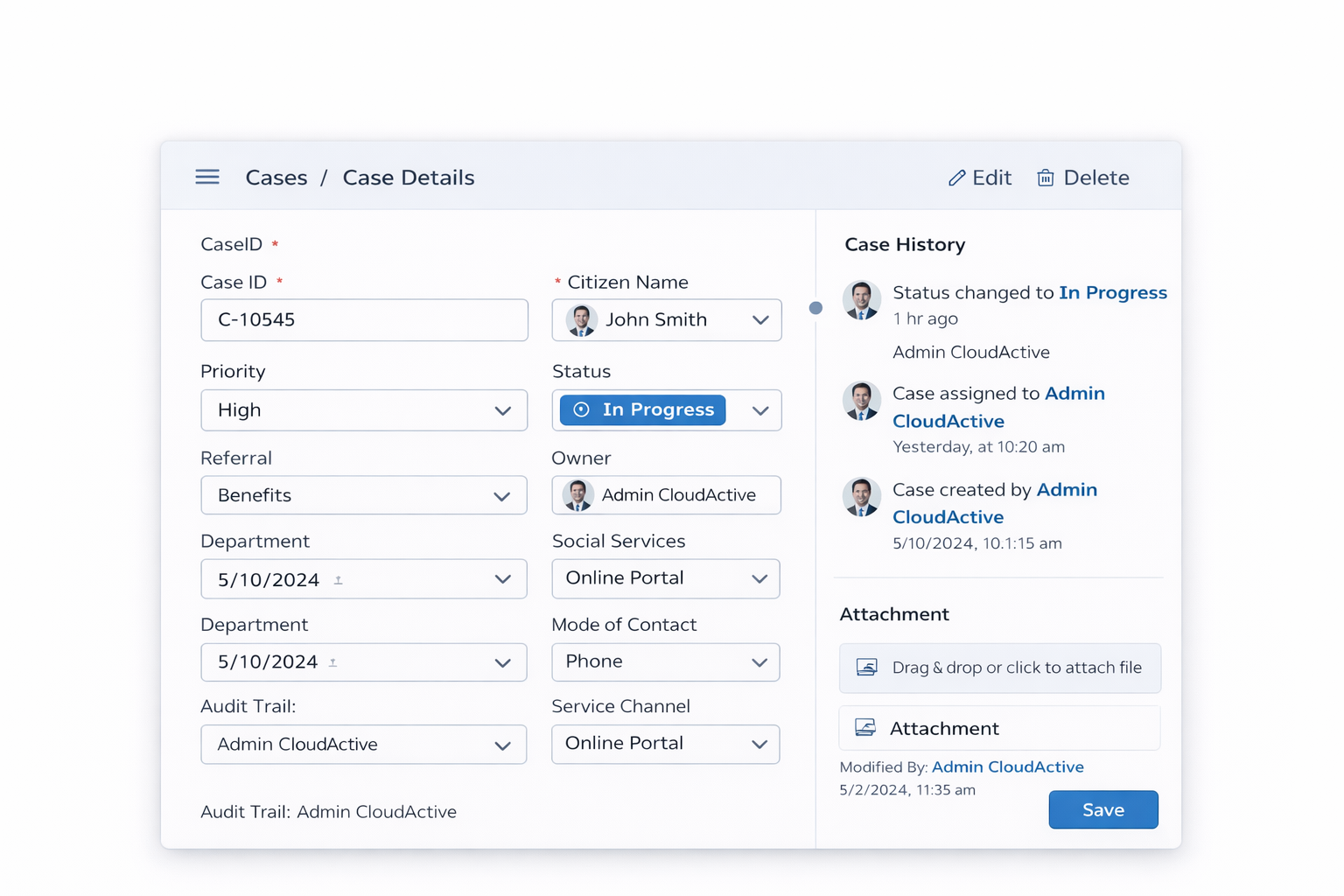 CloudActive consolidates operational data across departments to provide structured, real-time visibility into service demand, case performance, and compliance obligations.